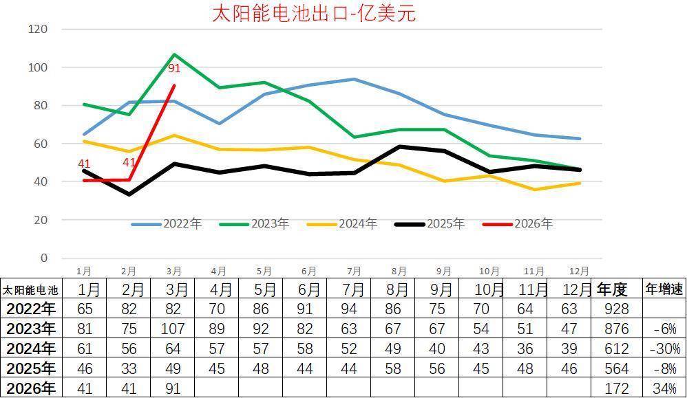 2026年1-3月太阳能电池出口达到172亿美元,增34%。3月太阳能电池出口暴增到91亿美元,同比增长84%。